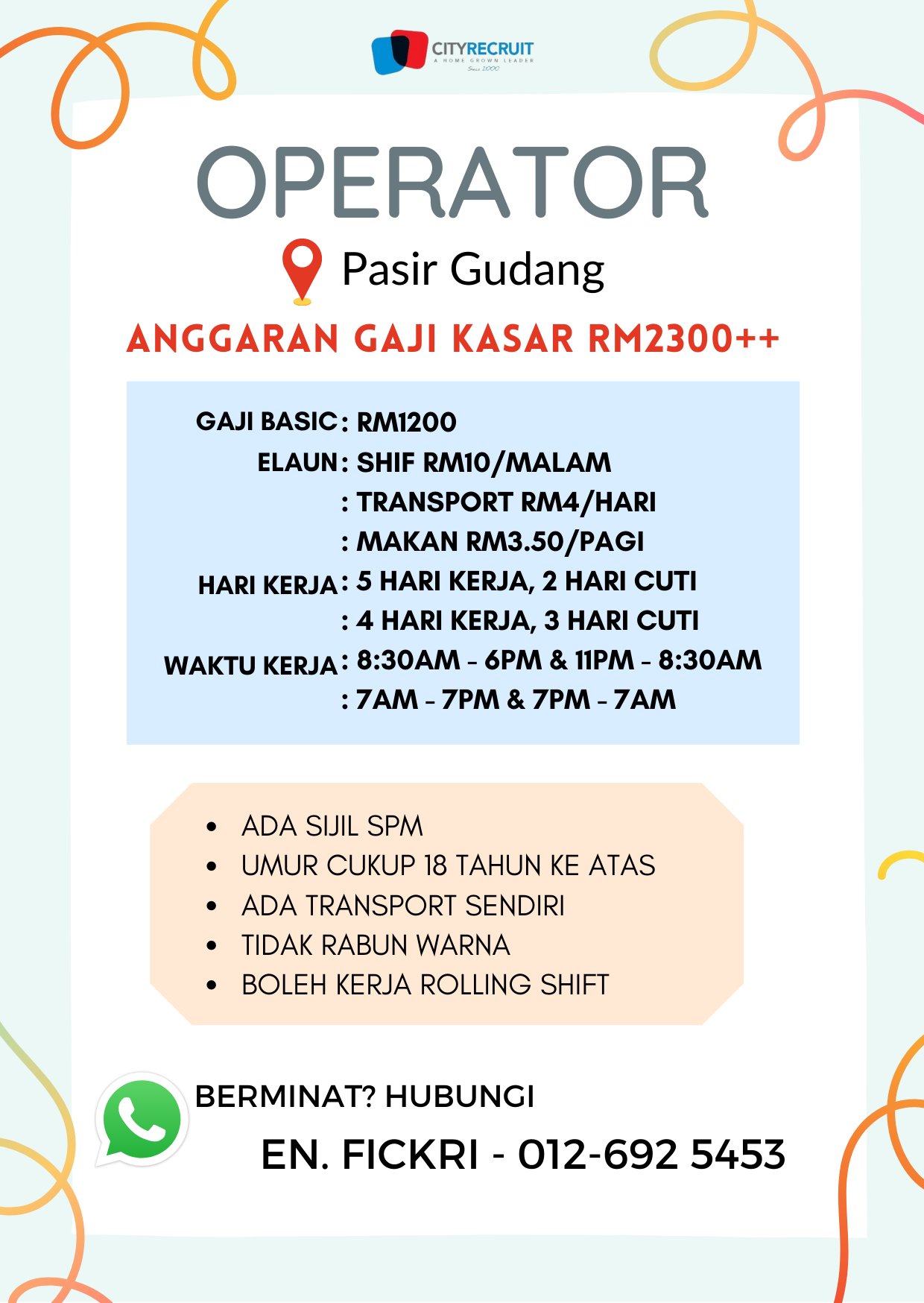 Kekosongan 100 orang jawatan operator segera. RM 1500 - RM 2000 a month. Senarai Jawatan Kosong di Johor.